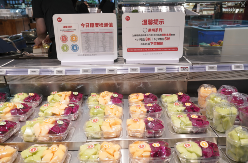 在果切区,新增的冷萃茶与广西酸野令人眼前一亮,每盒果切标注甜度编号,提示牌尽显巧思;蔬菜区的有机菜苗嫩叶带露,闽北高山空心菜与花青素紫甘蓝组成“健康方阵”,12款定向种植蔬菜的溯源二维码随指尖轻扫呈现生长历程;海鲜区宛如微型渔市,帝王蟹、波龙、面包蟹、珍宝蟹组成“进口四大金刚”,创新的“海鲜厨房”提供代加工服务解决家庭烹饪难题,“现杀现切+现场烹煮”的服务模式成为一大亮点,充分契合福州消费者对生猛海鲜和便捷加工的高频需求。
