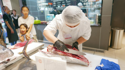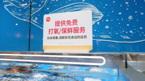 门店环境全面升级,采用“通透设计”理念,中岛货架齐肩高度让视野一览无余,通道大幅度拓宽。特别值得一提的是“海鲜厨房”创新场景,集活鲜展售、加工烹饪与堂食服务于一体,消费者可现场挑选海鲜并由厨师代工清蒸或香煎,即刻享用现烹美味。这一场景化体验精准契合了游客和年轻群体对即时、新鲜、互动式消费的追求。